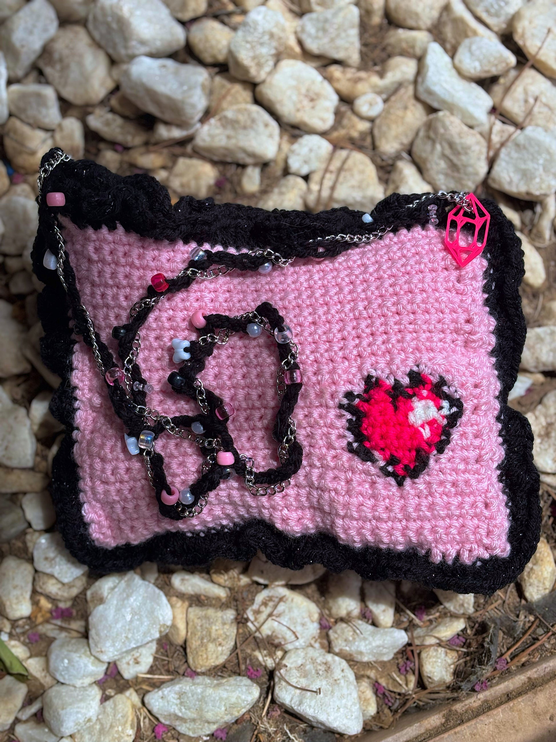 Handmade with acrylic yarn, stuffing, silver chain and plastic beads